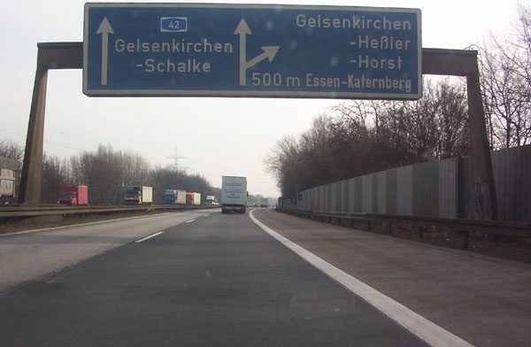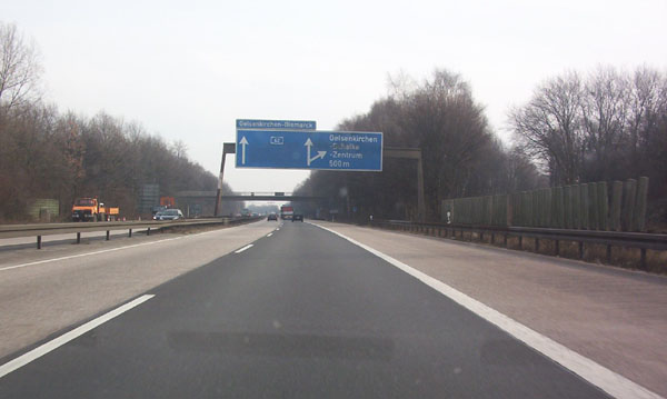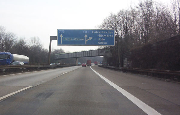 Vorwegweiser der AS 18 Gelsenkirchen-Bismarck. Wie die Fahrbahn wirkt auch dieses alte Ding wie ein Flickenteppich. weiter zu Teil 3 zurück zur Übersicht |
