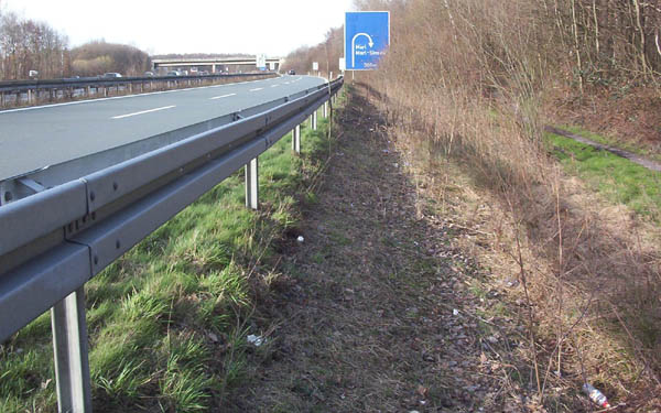 Hinter der im Hintergrund sichtbaren Bahnbrücke beginnt die A 43 bis zum Kreuz Marl-Nord die Haard, ein – vergleichsweise kleines – Waldgebiet, an ihrem Westrand zu streifen. Die Haard gehört zum Naturpark Hohe Mark.