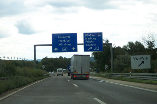 Einfahrt in das Kreuz Kassel-West (69) mit Wegweisung zum ansässigen VW-Werk.