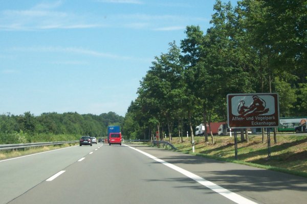 Touristenhinweis auf den Affen- und Vogelpark Eckenhagen auf Höhe des Parkplatzes.