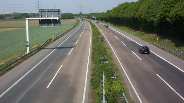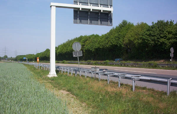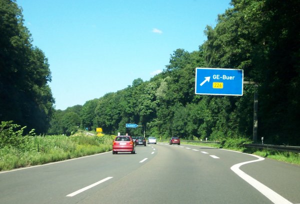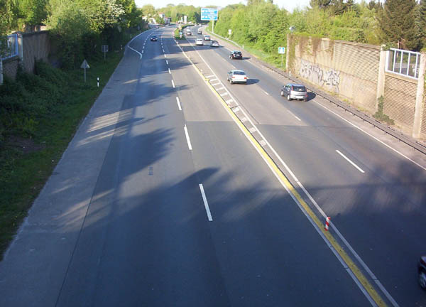 Am Vorwegweiser der AS Gelsenkirchen-Hassel. Ein sechsstreifiger Ausbau ist nicht vorgesehen. Vielmehr beruht der überbreite Seitenstreifen auf Vorleistungen zum Bau der Gabelung der ursprünglich geplanten A 41.