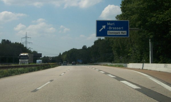 AS Marl-Zentrum. Hier kommt die A 52 dem "Chemiepark Marl", ehemans "Chemische Werke Hüls", besonders nah
