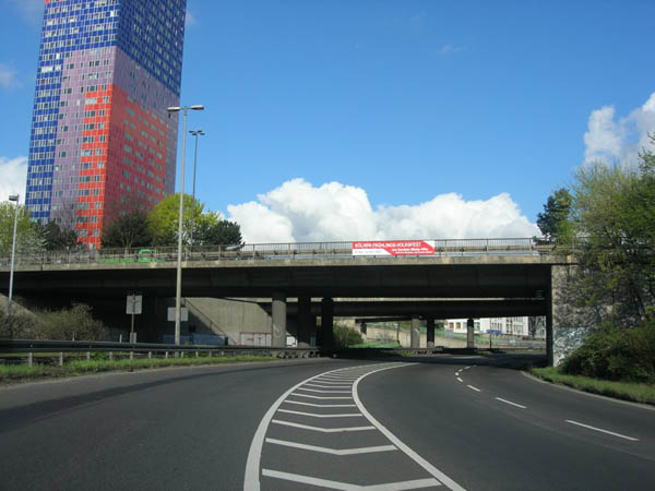 Das 100 m hohe und von zirka 1000 Personen bewohnte Herkules-Hochhaus in Ehrenfeld. Hier ist die Straße noch als K 4 gewidmet und als Kraftfahrstraße beschildert.