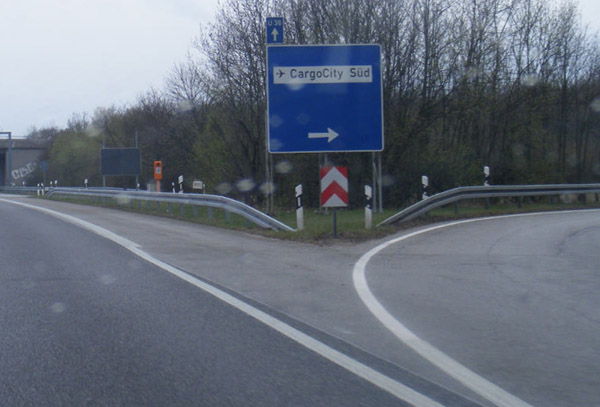 Zunächst die Abfahrt zur CargoCity Süd des Frankfurter Flughafens