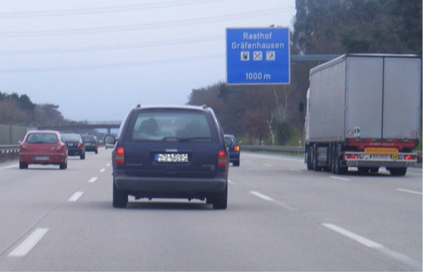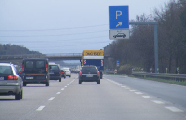 Ein großer Nur-PKW-Parkplatz-Wegweiser hinter der AS