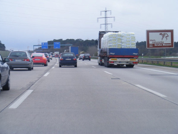 Touristischer Hinweis auf den stillgelegten Tagebau Grube Messel. Im Hintergrund eine Doppelankündigung eines Parkplatzes sowie der AS Weiterstadt.