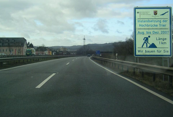 Baustellenschild bezüglich der Hochbrücke Trier
