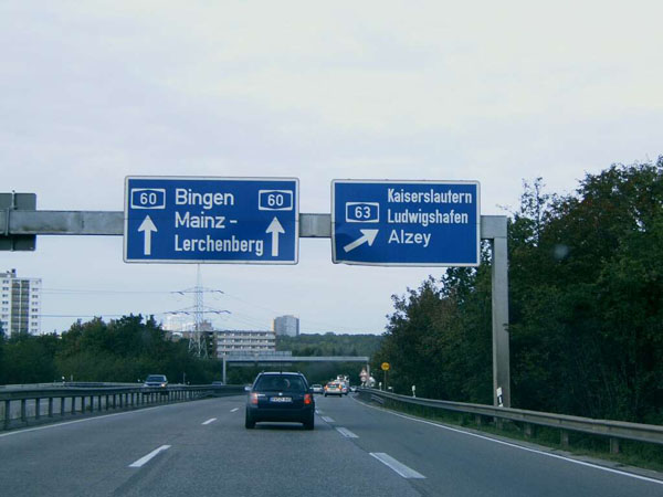Teil 2 des "Kreuz Mainz-Süd": Alte Wegweiser beim Abzweig der A 63 nach Kaiserslautern, die seit Oktober 2004 endlich durchgehend befahrbar ist.