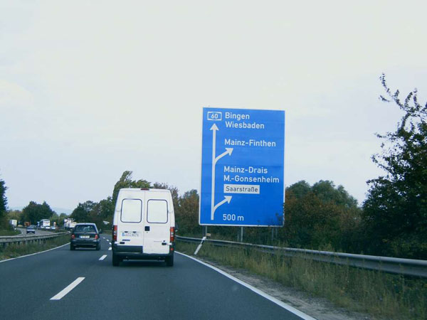 Teil 1 der Anschlussstelle: Abfahrt nach Gonsenheim und in die Mainzer Innenstadt. Der Wegweiser ist an besagtem Überflieger befestigt.