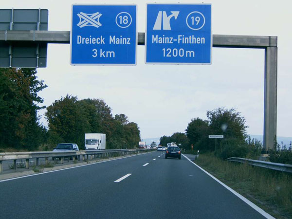 Ankündigung der AS 19 "Mainz-Finthen" und AS 18 "Dreieck Mainz". Dahinter befindet sich die Nothaltebucht.