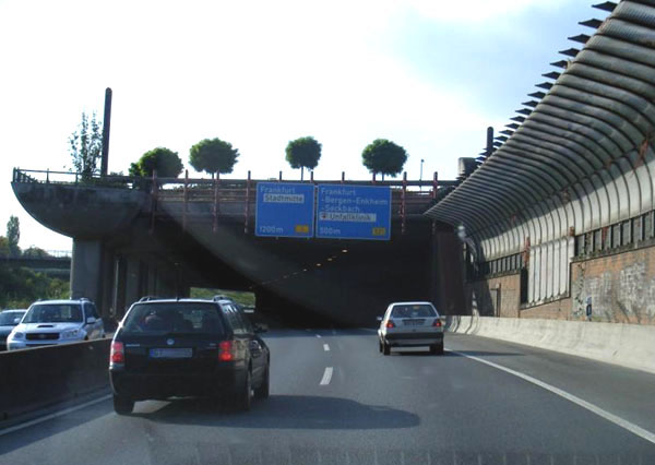 Der halb offene Tunnel "Galerie Seckbacher Landstraße" besitzt einen kleinen Park auf dem Dach und ist für das künftige Dreieck Seckbach (A 66 Richtung Wiesbaden) vorbereitet