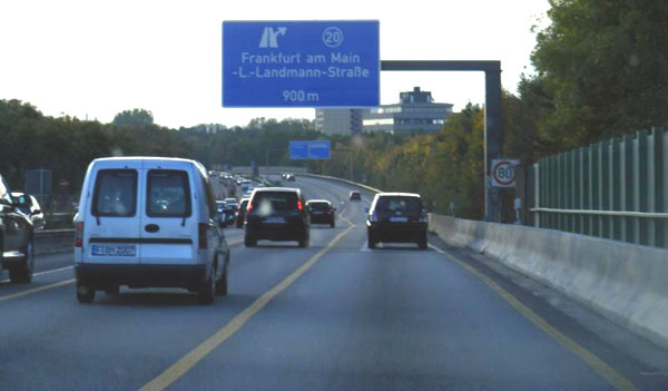 Vorwegweiser der beiden Teile der kleeblattmäßigen AS Lula (20): Ludwig-Landmann-Straße Richtung F-Praunheim...