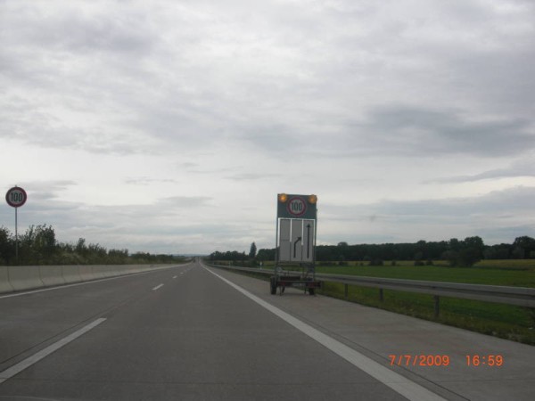 Geschwindigkeitsbegrenzung auf 100km/h mit Fahrstreifenwegfall wegen eben angekündigter Baustelle.