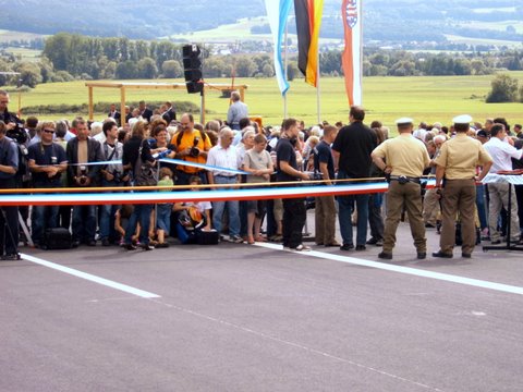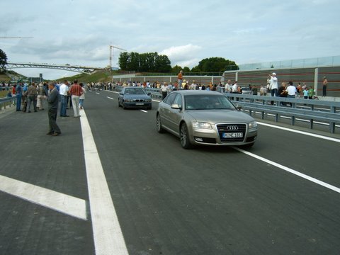 Nach der feierlichen Eröffnung werden die letzten Lücken der Schutzplanken im Mittelstreifen geschlossen.