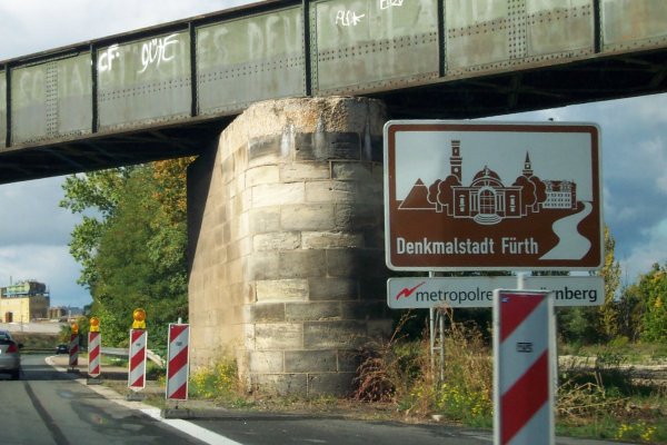 Touristenhinweis auf die "Denkmalstadt Fürth"
