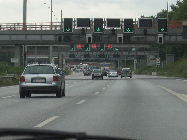 Zahlreiche Wechselverkehrszeichen vor Othmarschen zur Regelung der Verkehrsströme durch den Elbtunnel