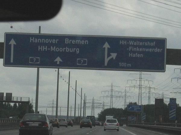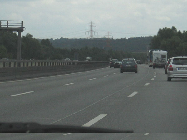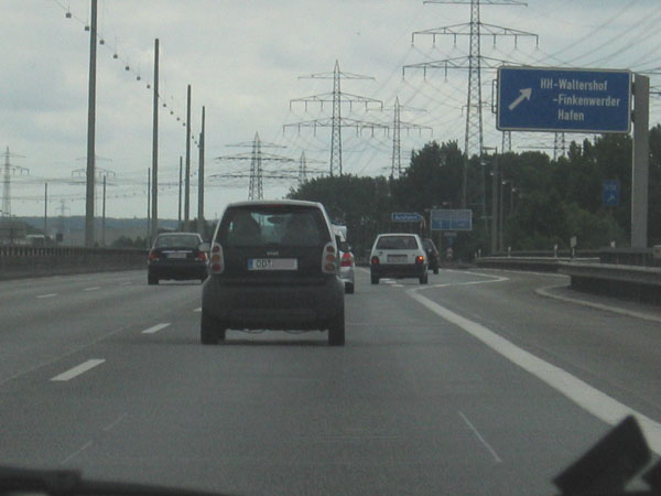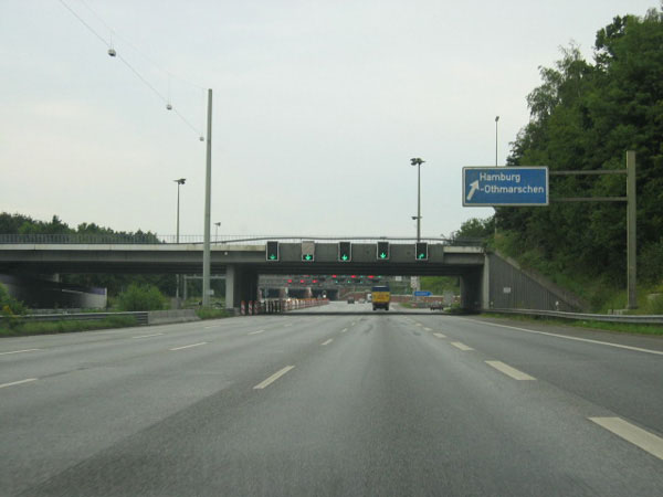 Richtgeschwindigkeit 130 km/h hinter Waltershof. Links im Bild der letzte Mast der Autobahnbeleuchtung.
