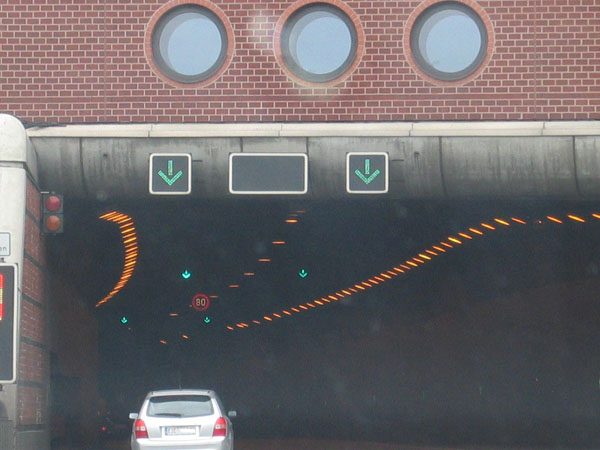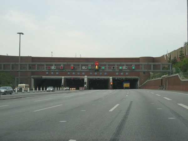 Das neue Portal des 2653 m langen Elbtunnels. Die rechte neue Röhre ist 3101 m lang. Im Normalfall stehen in beiden Richtungen 4 Fahrstreifen in 2 Röhren zur Verfügung.