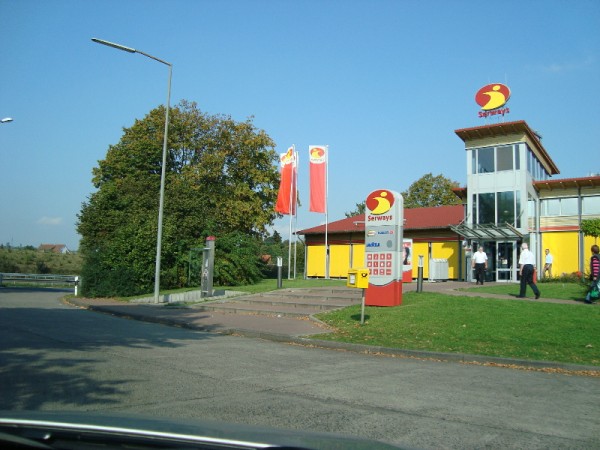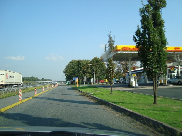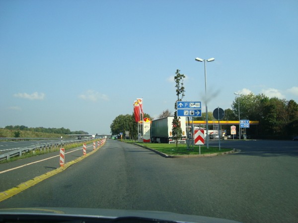Rechts befindet sich die auf der Autobahn angekündigte Shell-Tankstelle