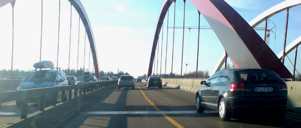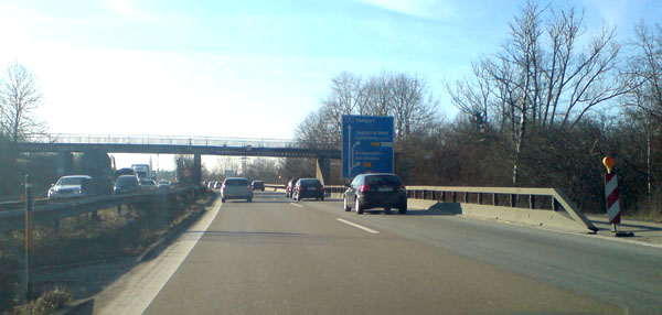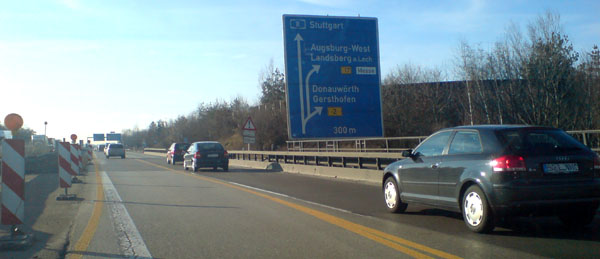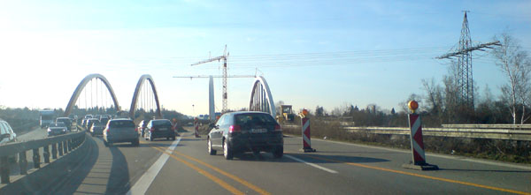 Diese Brücke bei Neusäß wurde erst später gebaut und ist deshalb bereits auf sechsstreifig getrimmt. Der Ausbau der A 8 Augsburg-Ulm beginnt 2009.
