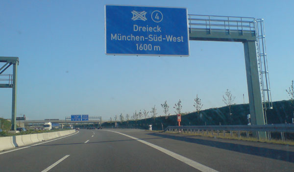 Noch im Bereich der AS Germering-Nord kündigt sich das Dreieck München-Südwest an. Die Schreibweise "Süd-West" sieht nicht nur seltsam aus, sie widerspricht auch den Richtlinien der wegweisenden Beschilderung auf Autobahnen (RWBA)!
