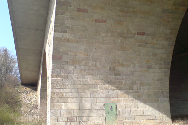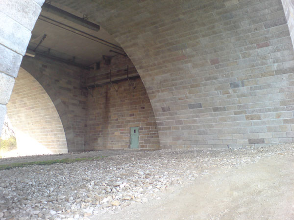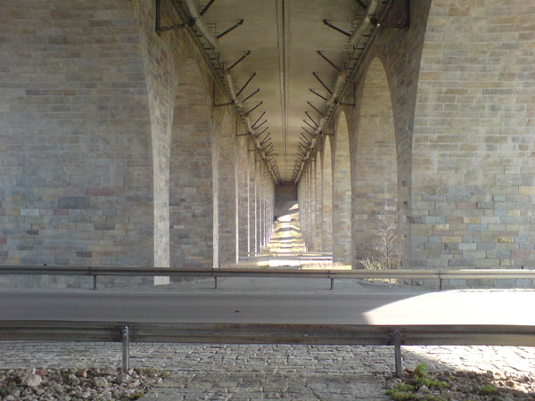 Unter der Brücke, Blick nach Süden. Hier sieht man deutlich die Fahrbahn- verbreiterung nach innen. Die vielen Rohre leiten das Regenwasser ab.