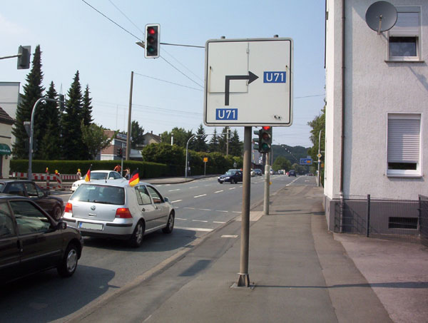 Blick von der Gegenseite in Richtung Dortmund auf eine äußerst seltene Bedarfsumleitungs- tafel! Diese erleichtert v.a. bei Autobahnsperrungen die Orientierung. Wie dieser Golf waren auch Wochen nach der Fußball-WM noch Fahrzeuge mit Deutschlandflaggen geschmückt.
