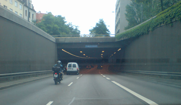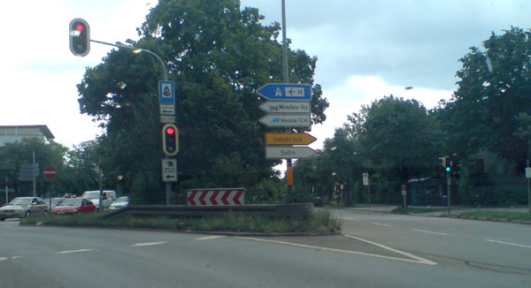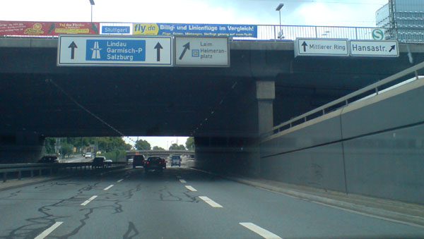 Kreuzung Murnauer Straße. Ab hier führt der Mittlere Ring nach Osten. Gleich hinter dieser Abzweigung wird der Tunnel Garmischer Straße enden.