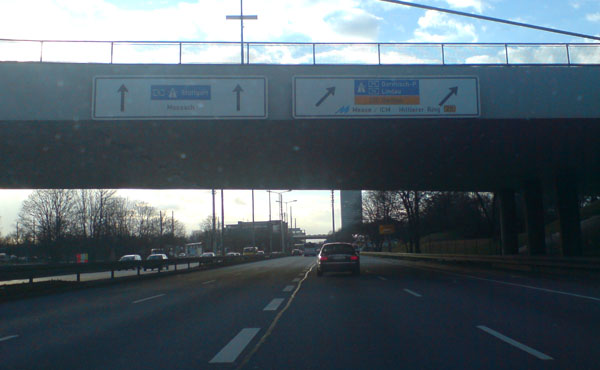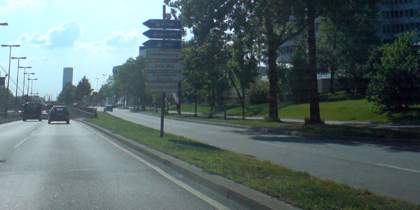 Erster Vorwegweiser des Olympiakreuzes. Die Hauptfahrbahn führt weiter in westlicher Richtung nach Moosach