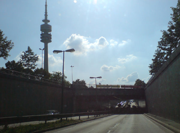 Unterführung der Lerchenauer Straße mit Blick auf den 290 m hohen Olympiaturm, der in 180 Metern Höhe ein sogenanntes Drehrestaurant beherbergt.