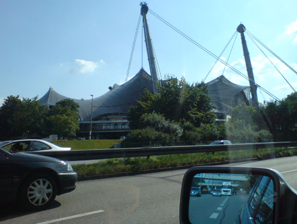Blick auf die Olympiahalle, die mit einer Zeltdachkonstruktion aus Acrylglas überspannt ist