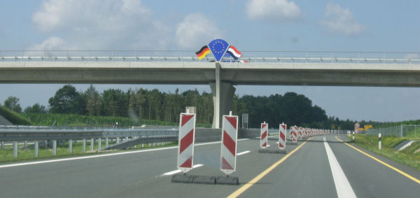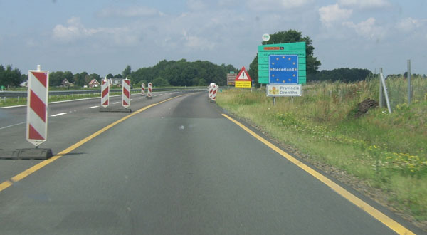 Grenzübergang Schöninghsdorf / Zwartemeer. Die grüne Tafel hinter dem Grenzschild ist das niederländische Pendant zum deutschen "Wir bauen für Sie!"-Schild. zurück zur Übersicht |