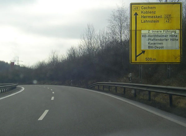 "[49] Cochem" wurde am Abzweig abgedeckt und mit einem Zusatzschild (nicht im Bild) geradeaus ausgeschildert