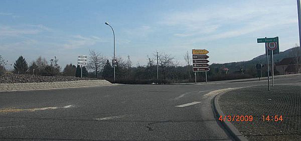 Einfahrt in den Kreisel. Hier hat wahrscheinlich jemand Getreide verloren.