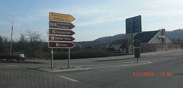 Im Kreisel Wegweiser zum Erlebnispark Straußberg, den Freizeitpark Possen, den Bebraer Teichen und das Schloss Sondershausen.