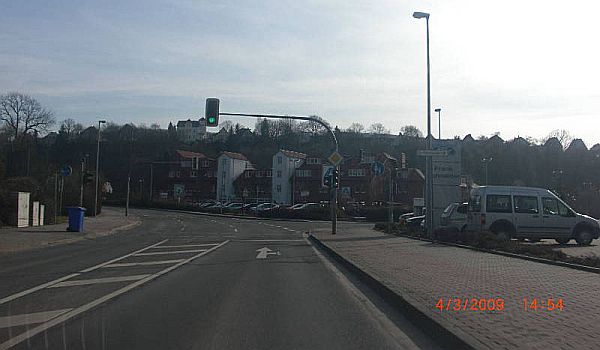 Geradeaus der Kreisel, rechts die Wipperbrücke