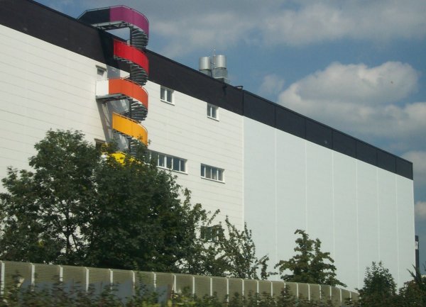 Markannte Wendeltreppe an einem Gewerbegebäude in Höhe des Abzweiges der B 51.