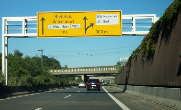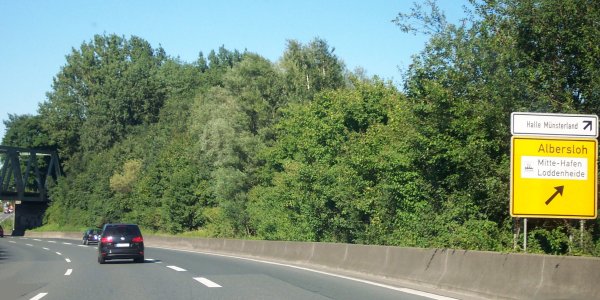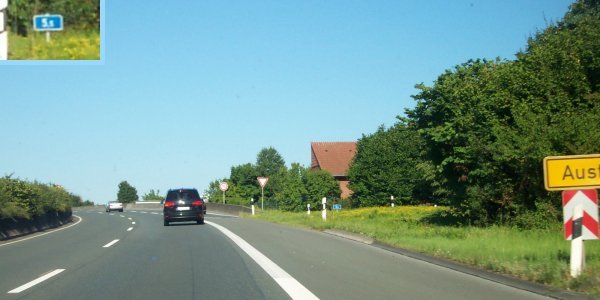 AS Halle Münsterland. Zu erkennen: die blaue Streckenkilometrierung wie bei Autobahnen, obwohl diese Umgehungsstraße gar nicht als Autobahn gewidmet ist (siehe Vergrößerung)!
