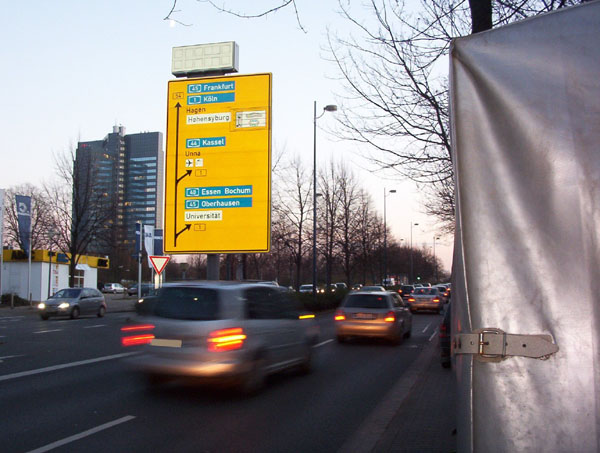 Vorwegweiser mit Wechselbeschilderung und einem Kasten darüber an der AS Dortmund- Zentrum (B 1). Der Kasten ist Teil eines Parkleitsystems zu den Westfalenhallen und dem Westfalenstadion (Signal-Iduna-Park). Das System wurde zur WM 2006 installiert.