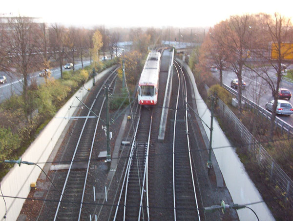 Eine U-Bahn der Linie U 45 in Anfahrt auf die nahe Station "Westfalenpark". Die U 45 zweigt hier in Richtung Westfalenhallen bzw. Westfalenstadion ab. Der Mittelstreifen der Ruhrallee ist hier besonders breit.