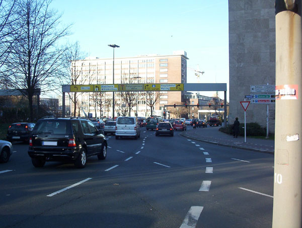 ...geht die B 54 auf den Wallring über. Dementsprechend ist es egal ob man links oder rechts abbiegt. Zumindest mit Ziel "Wallring", wie diese markante Schilderbrücke zeigt.