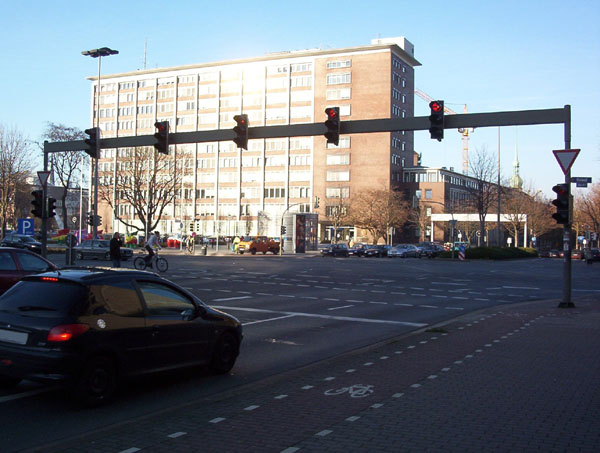 An dieser Kreuzung wird der Verkehr mittels Ampelbrücke geregelt. Das Haus hinter der Kreuzung ist das Stadthaus. zurück zur Übersicht |