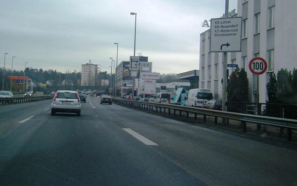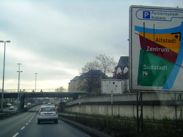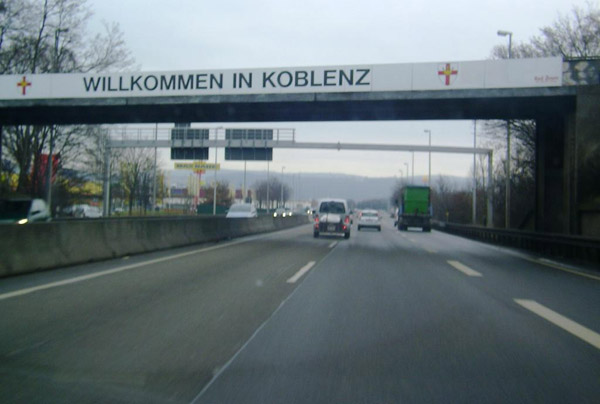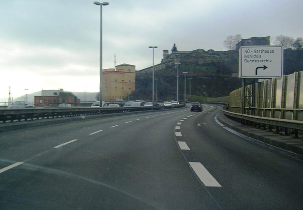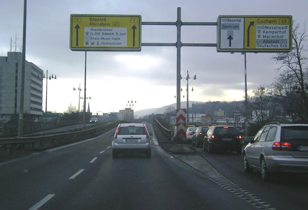 Auf der Europabrücke über die Mosel. Die beiden rechten Fahrstreifen, von der B 416 kommend, zweigen in die Innenstadt bzw. nach KO-Moselweiß ab. Und Vorsicht: Dukatenesel im Mittelstreifen!