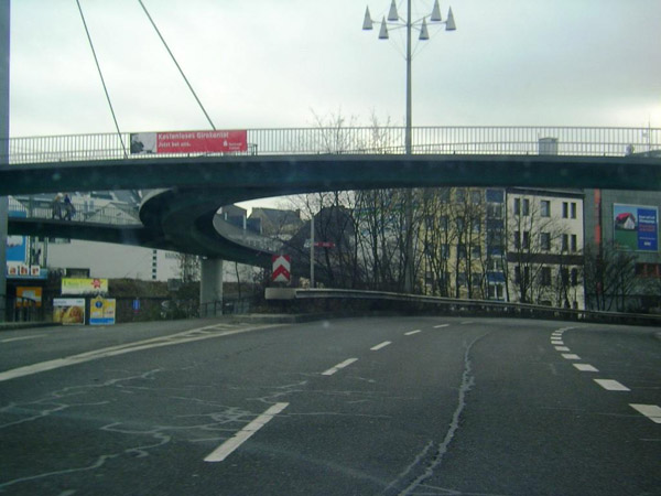 Fußgängerbrücke über das innerstädtische Bundesstraßendreieck. Der Fahrstreifen ganz rechts zweigt nach KO-Goldgrube ab.
