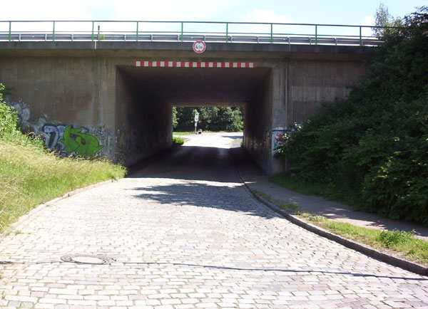 Bei der AS Bochum-Steinkuhl, die Zufahrt zum Opelring, über den auch das Opel- Hauptwerk zu erreichen ist. Auch hier eine Blockmarkierung aus eingelassenen Steinen! weiter zum Opelring