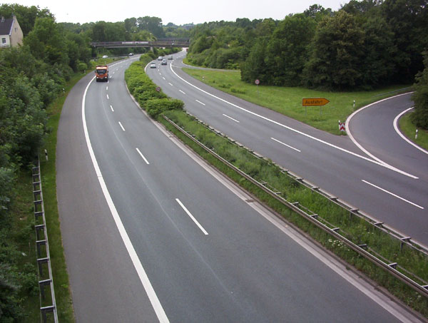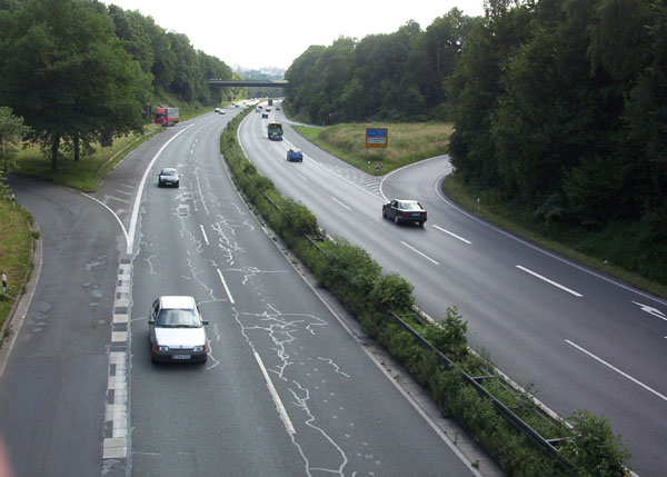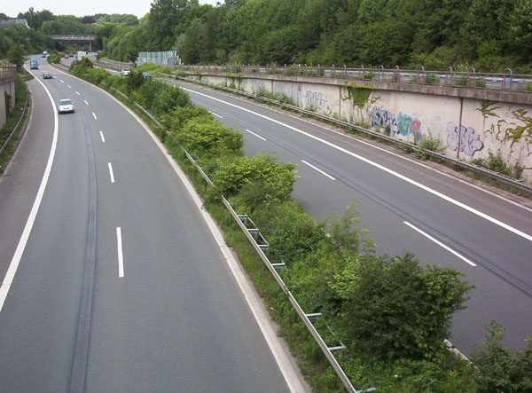 Die AS Wittener Straße ist fast wie ein komplettes Kleeblatt ausgebaut. Die Blockmarkierung der Auffahrt besteht hier aus jeweils zwei hellen Steinen, die in die Fahrbahn eingelassen sind. Überpinseln bringt da natürlich nichts.
