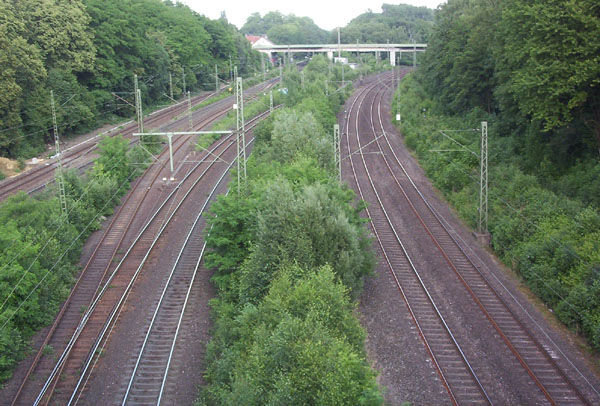 Hinter der AS Königsallee. In Höhe der Bahnbrücke im Hintergrund sollte ursprünglich die A 44 nach Velbert als ein Teilstück der DüBoDo abzweigen. Leider wurde die Planung verworfen, sodass sich der gesamte Verkehr weiterhin über die A 40 zwängt.
