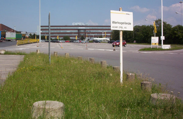 Blick über die Werksparkplätze von Opel auf das Hauptgebäude