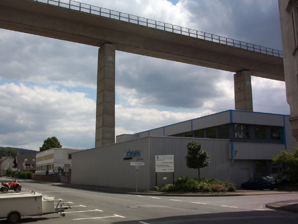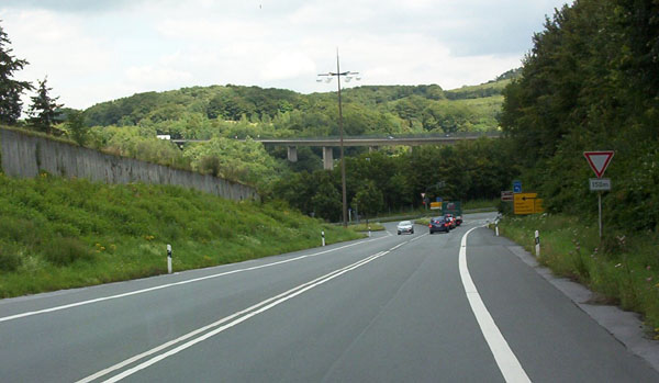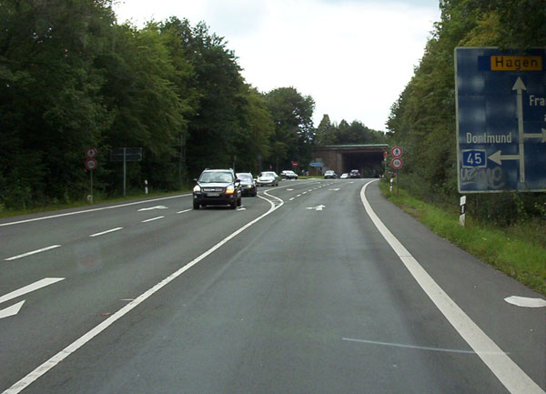 AS Hagen-Süd Ostseite mit Brücke der A 45. Ab hier geht die Straße "Zur Hünenpforte" in den „Volmeabstieg" über.