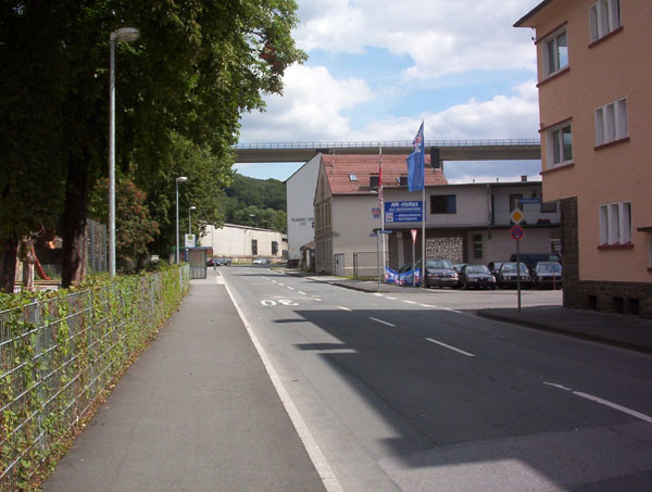 Vor der Einmündung des Volmeabstieges in die B 54. Auch an dieser Kreuzung gibt es diese markante Lampe (vgl. Lampe in der AS Feithstraße der A 46 / L 702). Im Hintergrund nochmals die Delsterner Brücke, über die wir gerade fuhren. Die Delsterner Brücke: